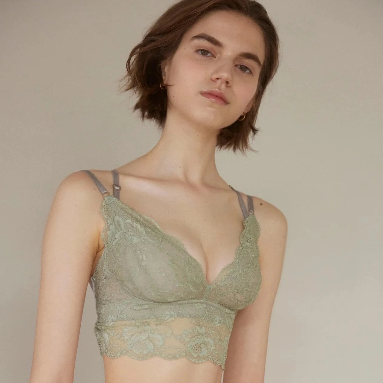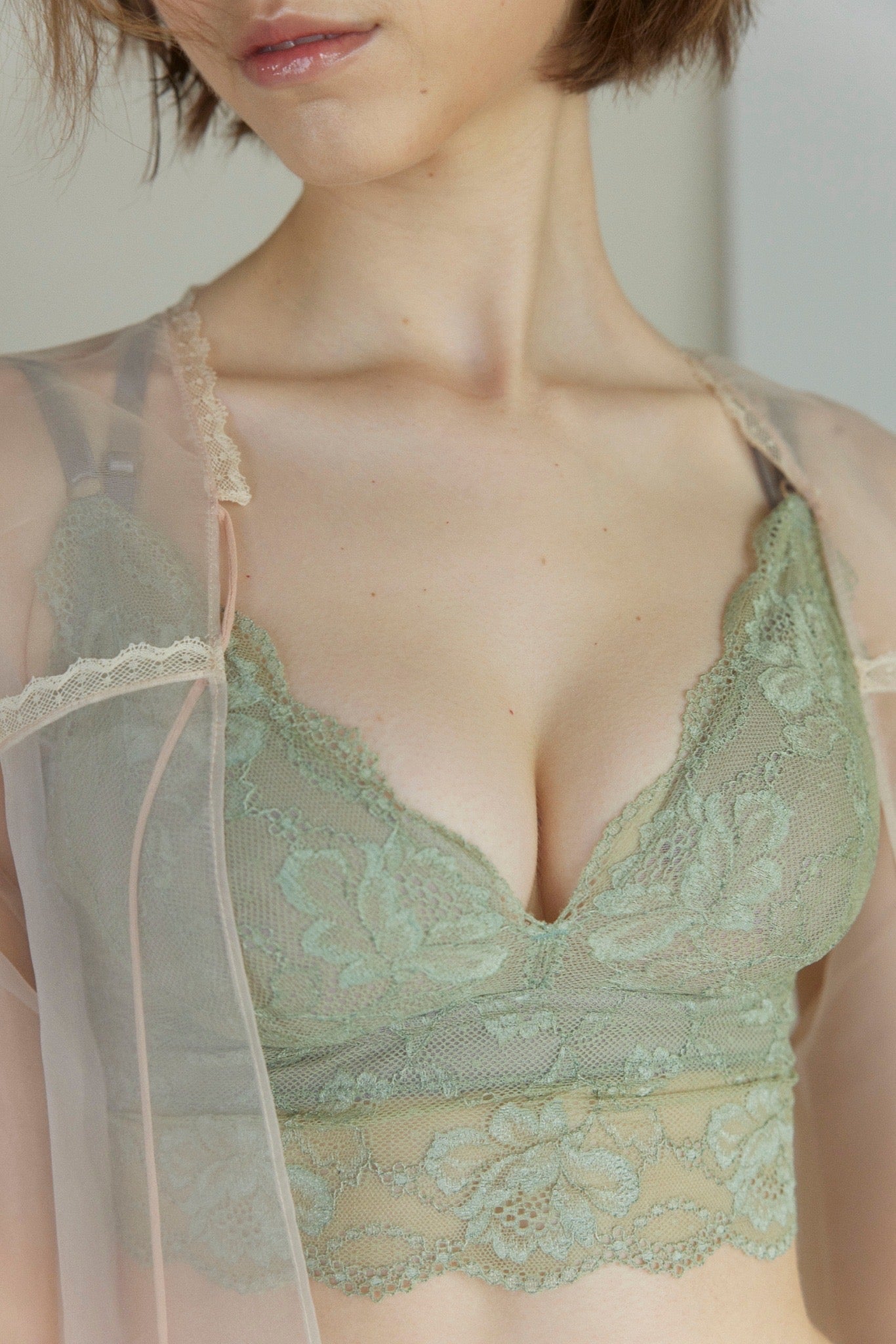 カップが付いていなくても適応できるフィット&ホールド感を実現。It uses stretchy lace made in Japan and fit to and hold your breast without caps.